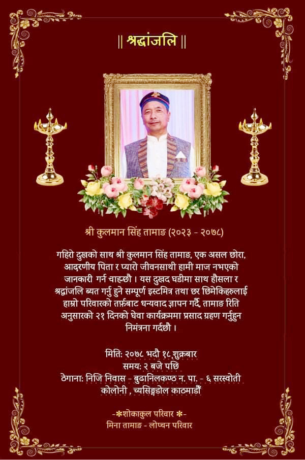 काठमाडौँ । नेपाल राष्ट्रिय तामाङ घेदुङले संस्थाका केन्द्रीय उपाध्यक्ष एवं समाजसेवी कुलमान लोप्चन तामाङको निधनप्रति श्रद्धाञ्जली कार्यक्रम सम्पन्न गरेको छ ।