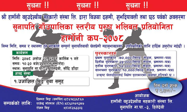 रामेछाप । विजयदशमी तथा शुभदिपावली छठ साथै नेपाल सम्बद्को शुभकामना आदानप्रदान कार्यक्रमको पावन अवसरमा हार्मोनी बहुउद्देश्यीय शहकारी लि.ले सुनापति गाउँपालिका स्तरीय पुरुष भलिबल प्रतियोगिता प्रथम हार्मोनी कप-२०७८ यहि असोज ३०, ३१ र कार्तिक १ गते सम्म हुने भएको छ ।